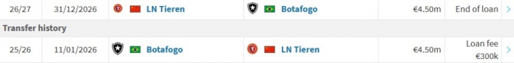 1月12日讯 根据德转信息,巴西边锋热菲尼奥租借辽宁铁人的租借费用为30万欧。